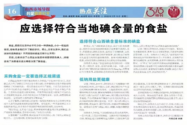 多地分公司利用电视广播专题活动、云直播、电子屏幕、和配送车悬挂横幅等形式进行宣传。活动中,工作人员向群众发放宣传资料近两千余份,宣传了《食盐专营办法》和国家盐业相关政策、《消费者权益保护法》、《山西省消费者权益保护条例》等法律法规,使广大消费者更多的了解“晋盐”产品,提高消费者对晋盐产品的信赖度,将“少吃盐、吃好盐、放心盐、选晋盐”的消费理念深入人心。