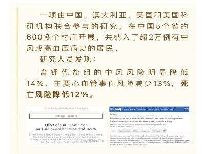 研究显示,只要把家里的盐换成低钠盐,即使吃盐量没变,血压还是降下去了。血压一下去,心血管疾病风险以及死亡风险自然而然也降低了。